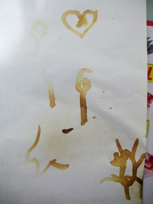 经过高温烘烤,白醋画过的纸面迅速显现出黄褐色的图案;而白糖画过的纸面显现图案的时间比白醋略长一些。