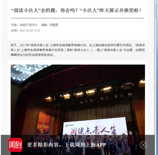 2017年,“阅读点亮人生”上海学生阅读素养培育计划项目(网络互动阅读体验),简称“阅读小达人”,是以“阅读点亮人生”为主题,在上海市语言文字工作委员会和上海市教育委员会指导下,由易班博雅网主办的市级网络互动阅读体验活动。从4月起上线的网络答题页面总共吸引了超过100000人次进行答题。